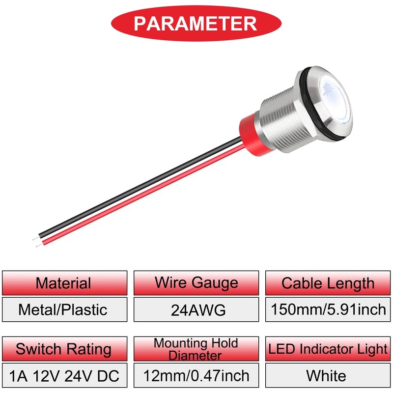 - SPECIFICATIONS:Mounting Hole Diameter:12mm;Cable Length:150mm /5.91inch;Wire Gauge:24AWG;Voltage:12-24V;LED Color:White.
