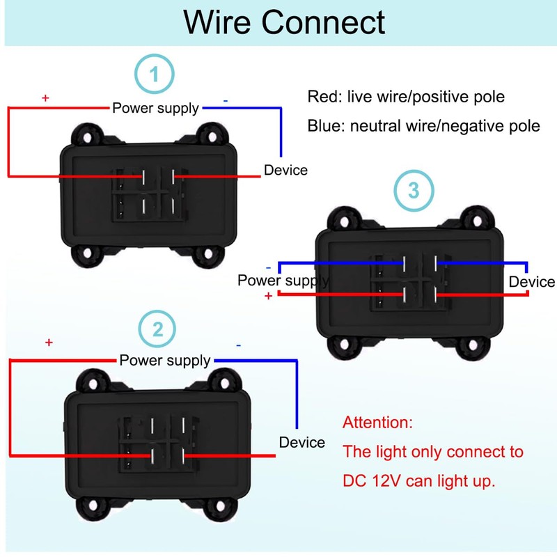 1. Before wiring, please confirm whether the power input and device output directions are correct. Reverse connection will cause the light to stay on. It will only light up when connected to DC 12V, not AC, and it cannot be connected to AC 220V or it will burn out.