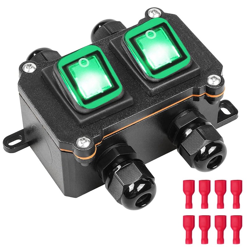 MKBKLLJY Inline Cord Switch IP66 Waterproof Switch Box DPST 12V DC 20A 8 Pin 2 Position ON/Off Outdoor Toggle Switch with Green Light Rocker Button Switch Double Side Two-Side Entry & Exit Line