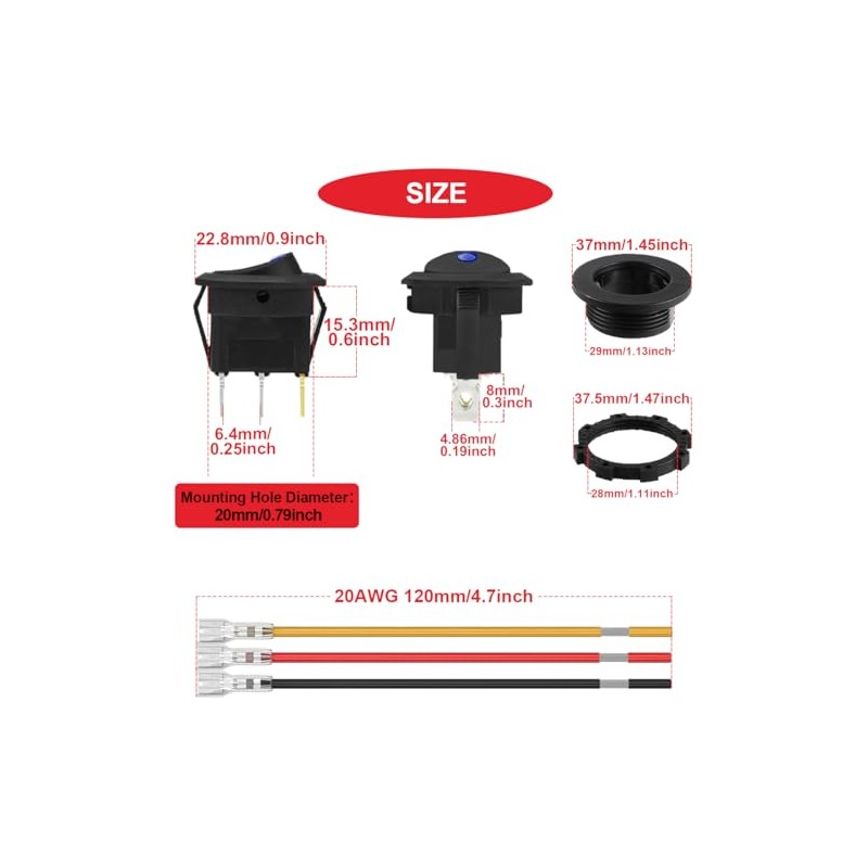 Specifications:Rated Voltage and Current:20A 12V DC/10A 24V DC;Positions:2(ON/OFF);Pin Quantity:3;Mounting Type:Panel Mount;Contact Type:SPST;Mounting Hole Diameter:20mm/0.79inch;Cable Length:120mm/4.7inch;Wire Gauge:20AWG;Material:Plastic, Metal.Package Content:2 x Blue LED Round Rocker Switch;6 x 4.8mmTerminal Wires;6 4.8mm Insulating Sleeve;5 x Wiring cap.
