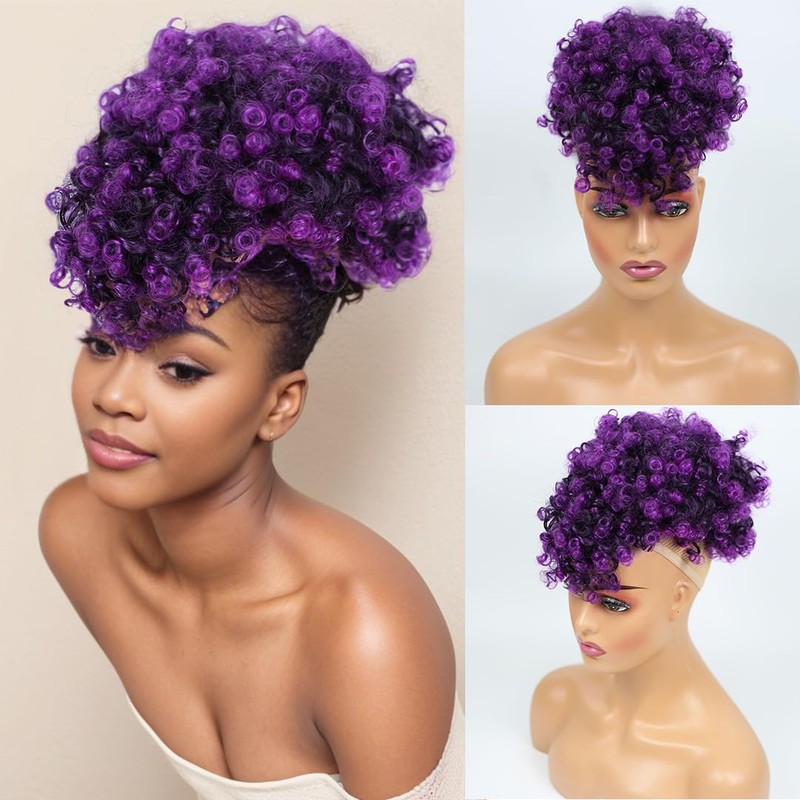 MKJVEN Short Drawstring Ponytail Extension Blonde Afro Puff Drawstring Ponytail With Bangs For Black Women Kinky Curly Mohawk Wigs Hair Clip In Bangs (Tpurple)