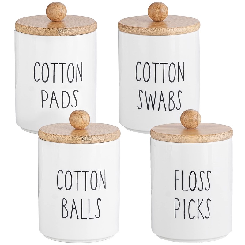 - Functional and Attractive : Ceramic jars with bamboo lids is designed for organizing cotton swabs, balls, pads, floss, and etc. in the bathroom, while making it looks neat and beautiful. Practical and decorative, it will be elegent elements for home decor, modern or farmhouse bathroom decoration.