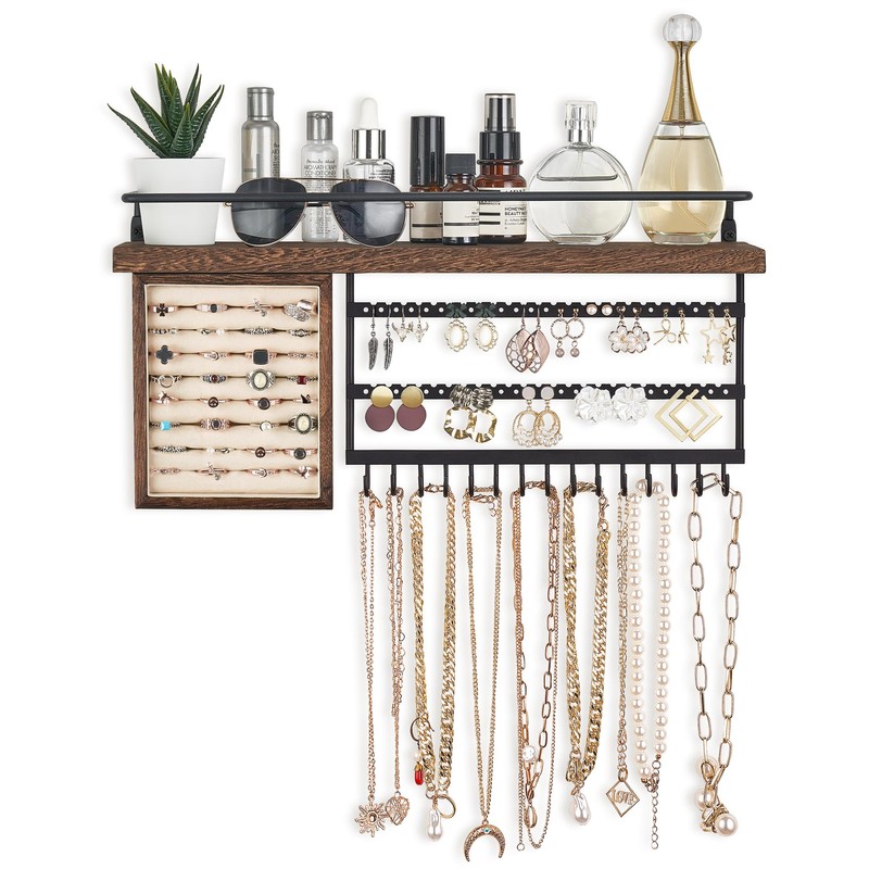 • Rustic Jewelry Shelf organizer:The top display shelf of this hanging jewelry storage organizer provides additional space to place your cosmetics,skincare products,making better use of wall space and freeing up the space of your dressing table.The railing design of the hanging shelf can prevent items from falling off.