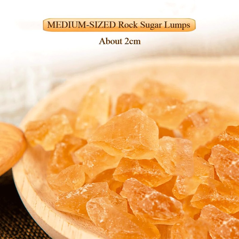 - MEDIUM CHUNKS: In order to meet the different needs of more customers, we have newly added medium-sized yellow rock sugar for you to choose from. Compaired small grains of yellow rock sugar, this medium grain is more suitable for soup, stew and stir-frying to get sugar coloring.