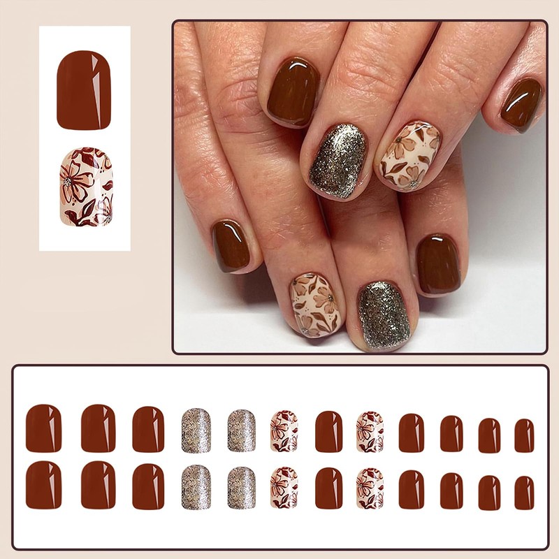 Mkwntg Fall Press on Nails Short Square Fake Nails Glossy Glue on Nails with Gold Glitter Designs Stick on Nails Brown Flower Full Cover False Nails Thanksgiving Autumn Acrylic Nails for Women 24Pcs