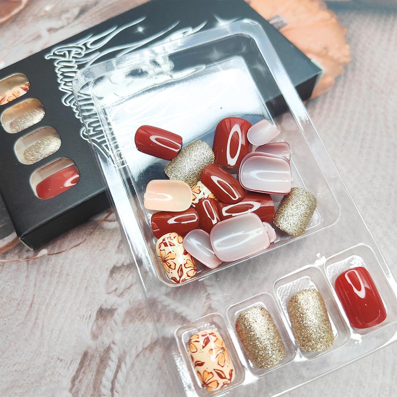- Easy Application: Autumn maple leaves fake nail with gold glitter patterns designs just choose the nail piece that suits you, polish the nail bed, paste the jelly glue we give away, and press trendy nails for 30s to get the natural manicure that girls like