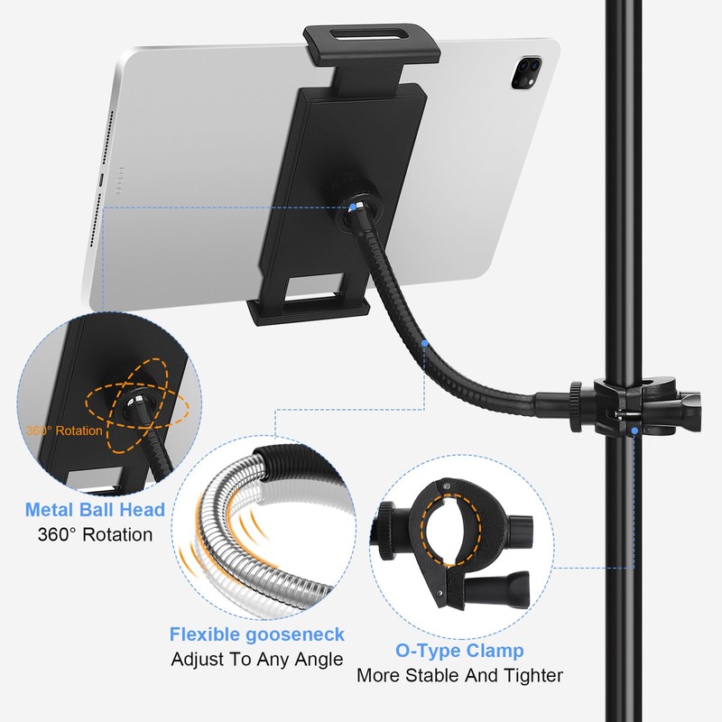 - Safe The microphone stand tablet holder is designed with O-style buckle lock to the microphone stand, provides strong clamping force and makes your tablet more stable and secure, not drift down when you touch or use the microphone stand tablet holder.
