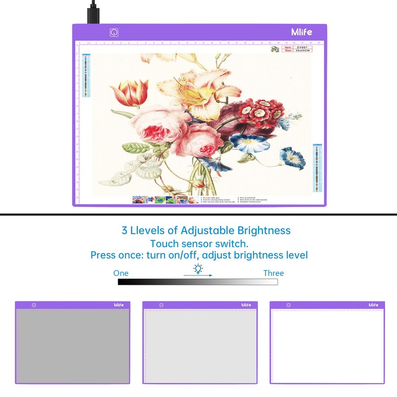 - 【A4 Light box include in diamond painting tool kit】 A4 light box for tracing comes with a USB cable,The thickness is only 4.7mm which makes this light pad portable. The illumination is perfectly even, super bright, and flicker-free.you can put light box and other diamond painting tools inside of Mlife diamond art storage case;