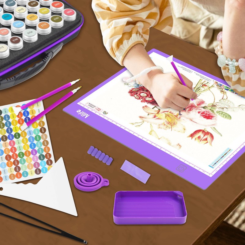 Mlife Diamond Painting Storage Boxes,1 Diamond Painting A4 Light Box Tracing Light Board with 3 Brightness, 80 Slots Bead Storage with 5D Diamond Art Accessories and Tools Kit(Purple)