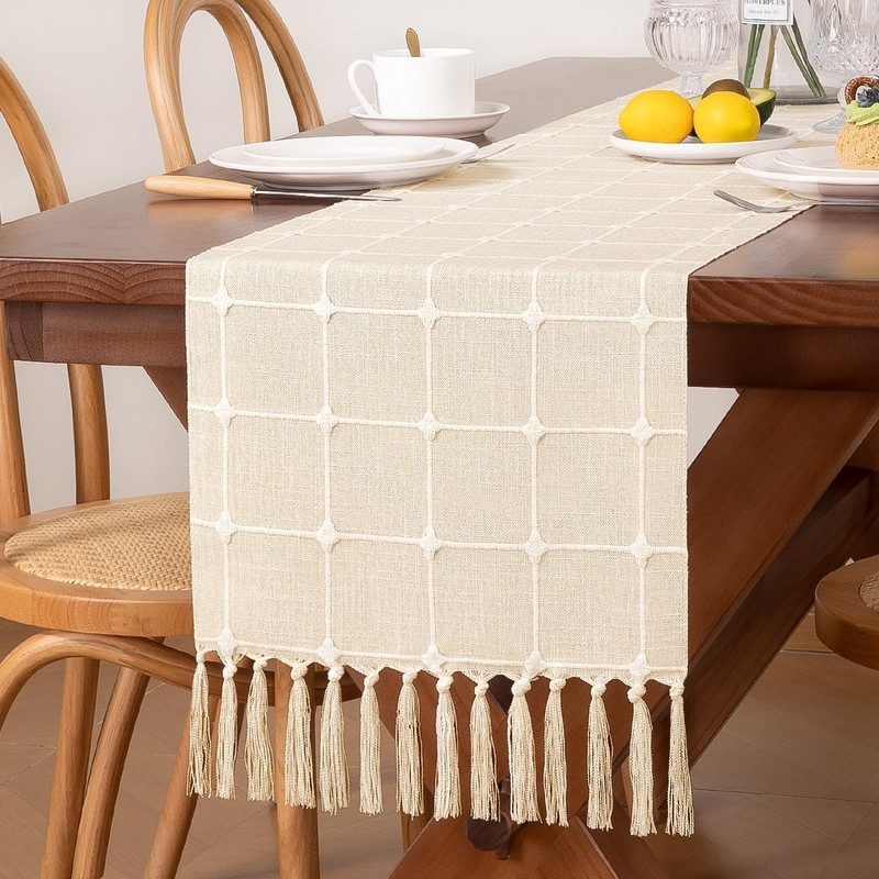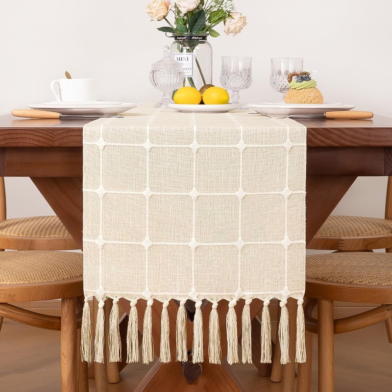 MLMC Rustic Embroidered Lattice Table Runner 72 Inches Beige Cream Plaid Farmhouse Table Runner Checkered Runner with Tassels 13"x 72" for Dinning Bridal Shower Table Decor