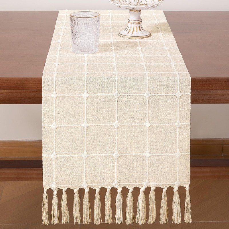 Made of high quality cotton linen fabric, this table runner features a chic surface lattice design and handmade fringe detail.