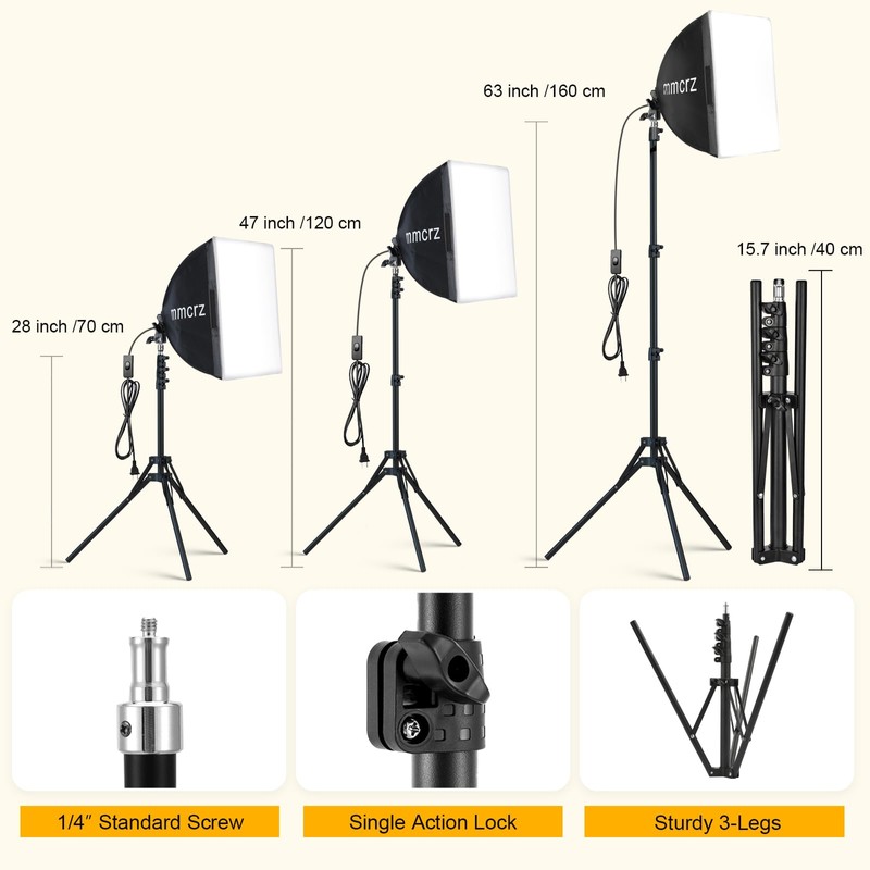 - 【 Adjustable Tripod Stand】The studio softbox stand upgraded to premium aluminum alloy tripod, can be easily scaled and pulled up, stable base. Easy to operate, lock the telescopic pole with knob. Tripod height reach up to 63"