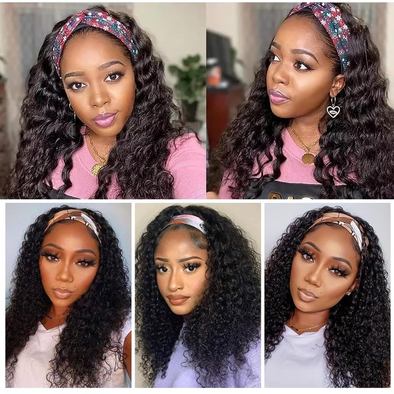 mmiQus 12A Headband Human Hair Wigs Water Wave None Lace Front Glueless Wig With Pre-attached Scarf for Black Women Curly Water Wave Put and Go Wig Natural Beginner-Friendly 16 Inch