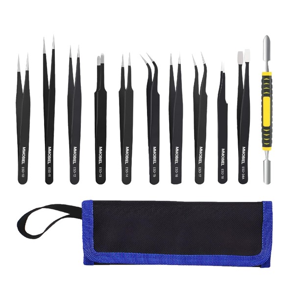 MMOBIEL 10x Industrial Precision ESD Tweezers Anti-Static Stainless Steel for Electronics Tools, Jewelry, Computer, Laboratory Work, Crafts and Hobbies etc. – Incl. Spatula and Case