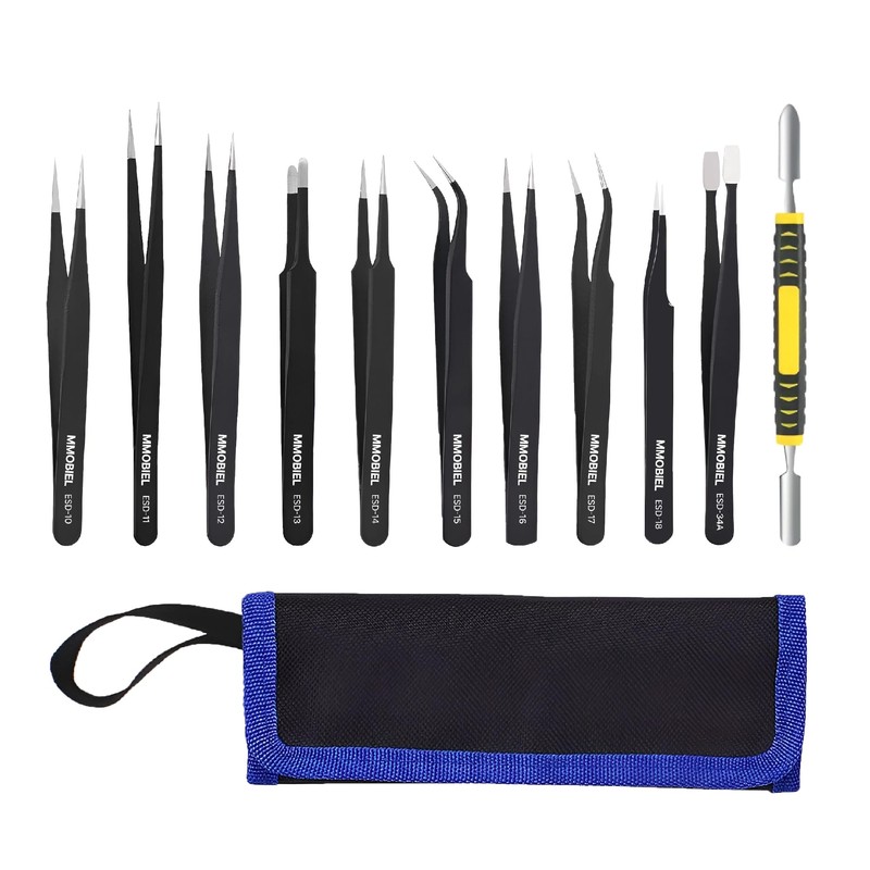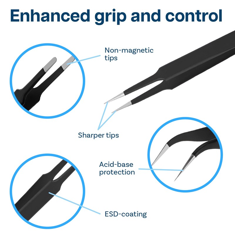 This tweezer set is designed for electronics work, these tweezers feature advanced Electrostatic Discharge (ESD) protection. The anti-static stainless steel construction safeguards sensitive electronic components, making them an essential tool for professionals and DIY enthusiasts alike. It will not cause static damage to sensitive electronics.