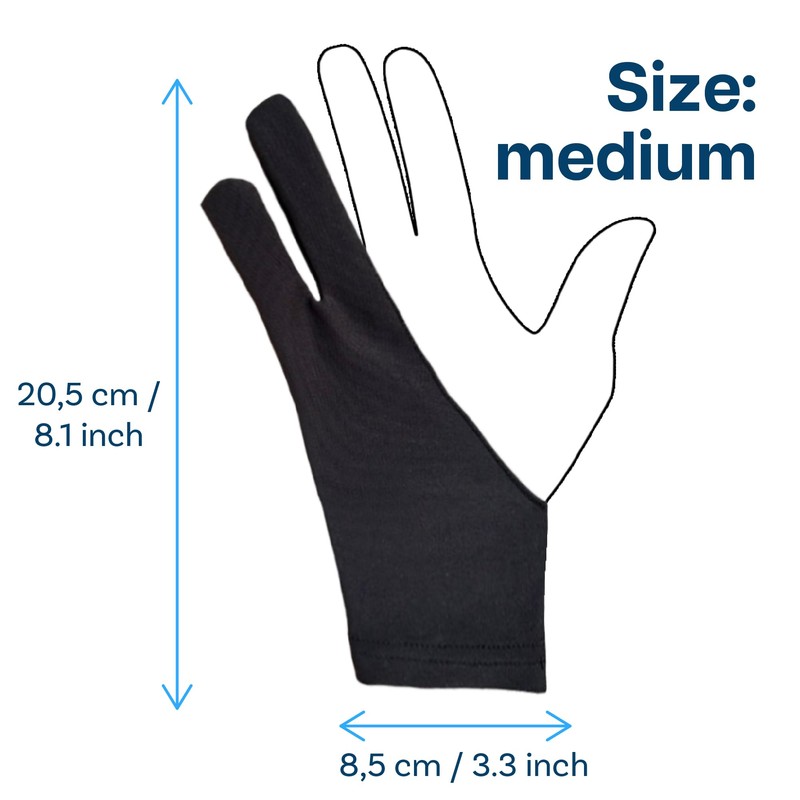 - Medium - The artist drawing glove in size medium is 8.5 cm wide and 20.5 cm long. Due to the elasticity of the glove, it can fit up to a length of 20.8 cm.