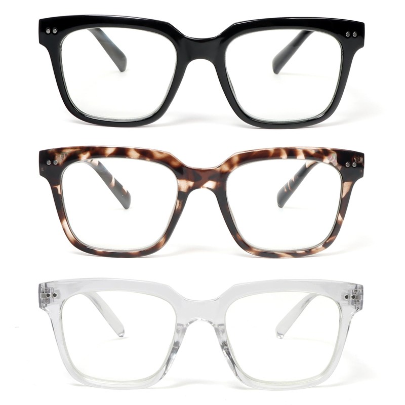 MMOWW 3 Pack Square Reading Glasses with Spring Hinges Oprah Style Blue Light Blocking Computer Readers for Women Men, Black/Clear Tortoise/Transparent +2.5