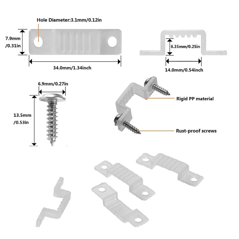 1)Double holes and rigid : hollow heigh only 6.0mm/0.24inch so this mounting clip more cling to the led rope light.more tight after fix the screws.never worry about the led rope light slide or drop.