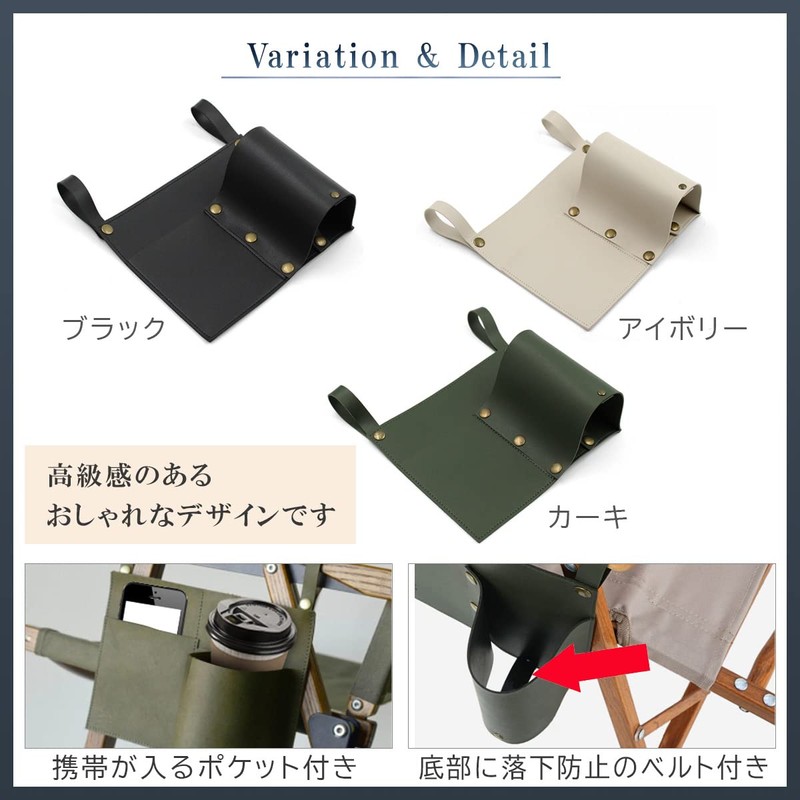 - For Outdoor: Great for camping, barbecues, and more. Easy to install on chair armrests It is useful not only for drinks, but also for temporary small items. Small pocket for smartphone etc. PU leather fashion design
