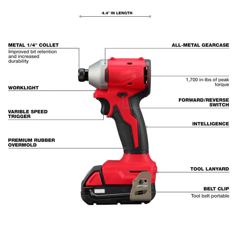 - Compact size allows for unrivaled access in tight spaces Brushless Motor delivers the power to quickly complete most common applications Enhanced variable speed trigger control helps reduce damage to fastener and material Professional Durability with all metal gearcase and gears 1,700 in-lbs. of Peak Torque 4.4" in Length and 2.1" in Width 1.7 lbs tool only