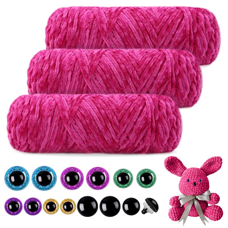 Mngevcy 3 x 150 m Chenille Wool for Crochet, Fluffy Wool, Soft Chenille Yarn with 14 Safety Eyes for Knitting, (Rose)