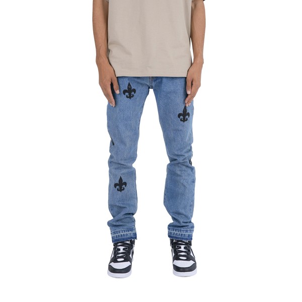 • D112 Fleur Denim is designed with our new D fit which is relaxed throughout with an extended inseam for stacking and features a warm, vintage wash, with whiskering and sanding throughout, and finished with poly-leather fleur de lis appliques throughout.