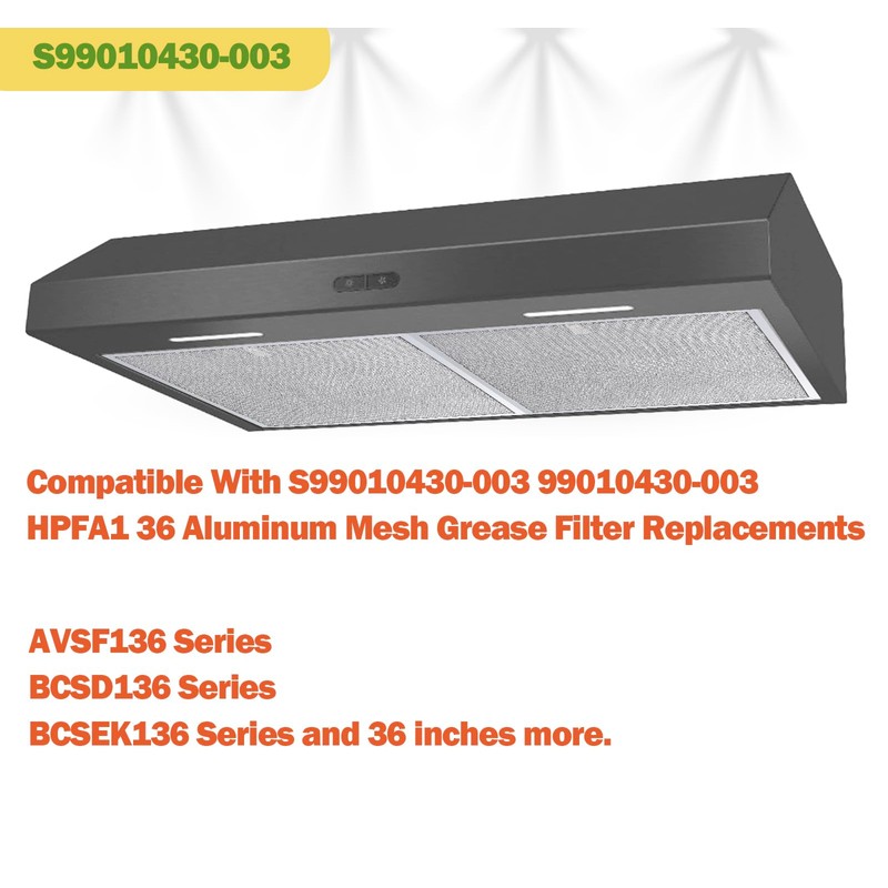 - Part Number – S99010430-003, 99010430-003 Range Hood Grease Filter Replacements For AVSF136 Series, BCSD136 Series, BCSEK136 Series, and more. Package Contains 2 Filters.