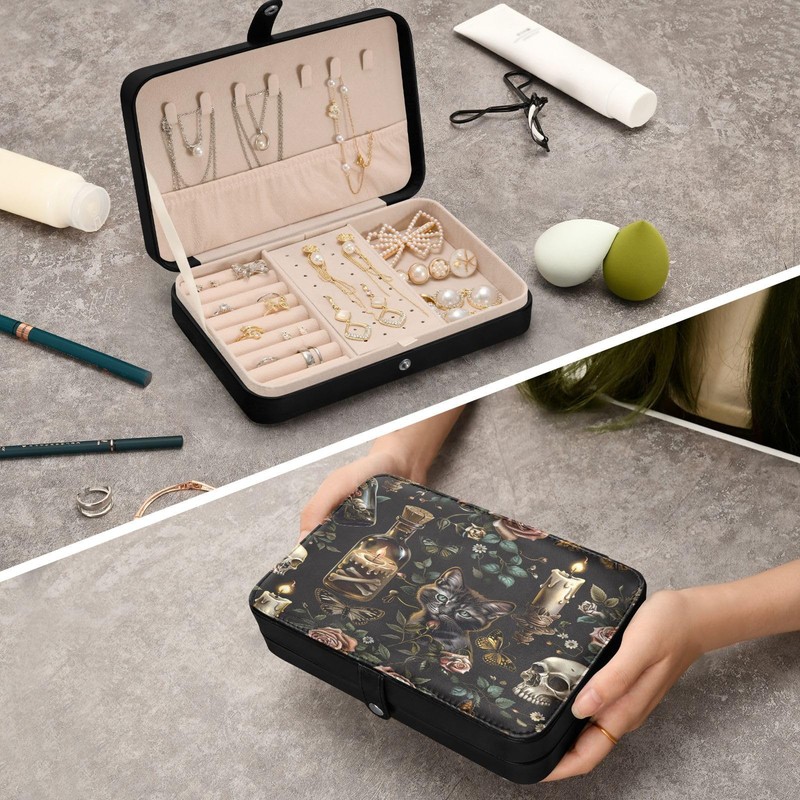 Mnsruu Cat Leather Jewelry Box, Black Skulls Cats Gothic Style Necklace Ring Earrings Storage Organizer for Women Travel Jewelry Organizer