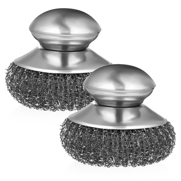 -Comfortable handle: metal dish scrubber with ergonomically designed handle provides a comfortable grip, reducing hand fatigue and preventing slips during use stainless steel dish scrubber