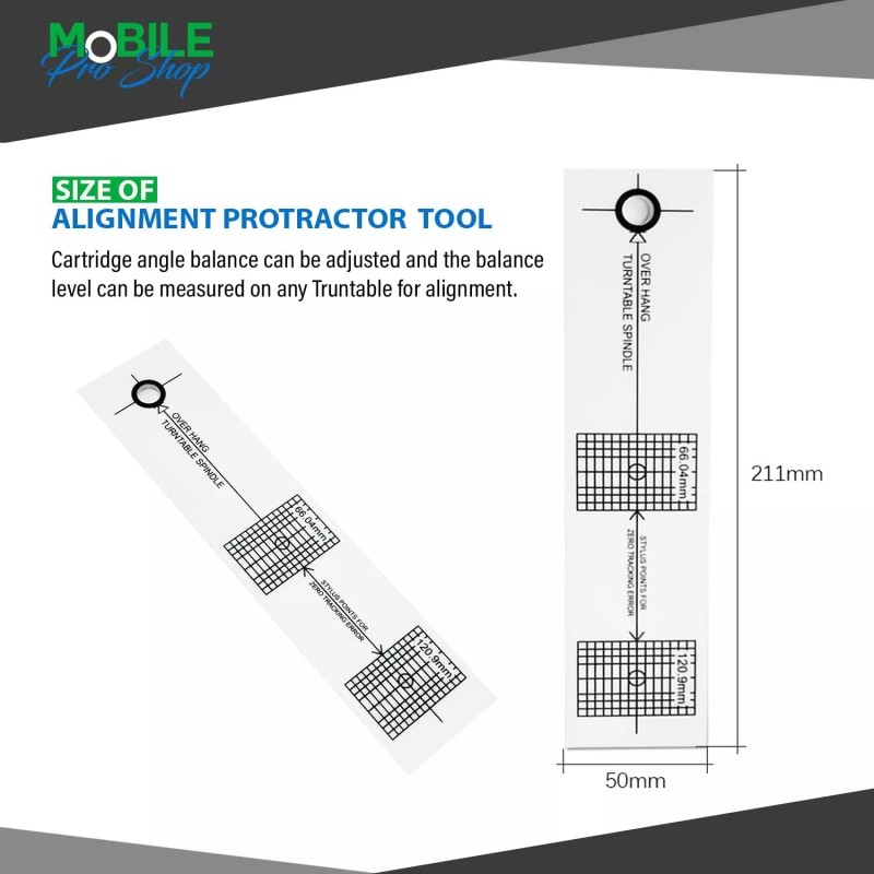 Made from premium acrylic material, the Mobile Pro Shop Alignment Protractor and Azimuth Cartridge Ruler ensure durability and precision for perfect turntable setup. Elevate your vinyl experience!