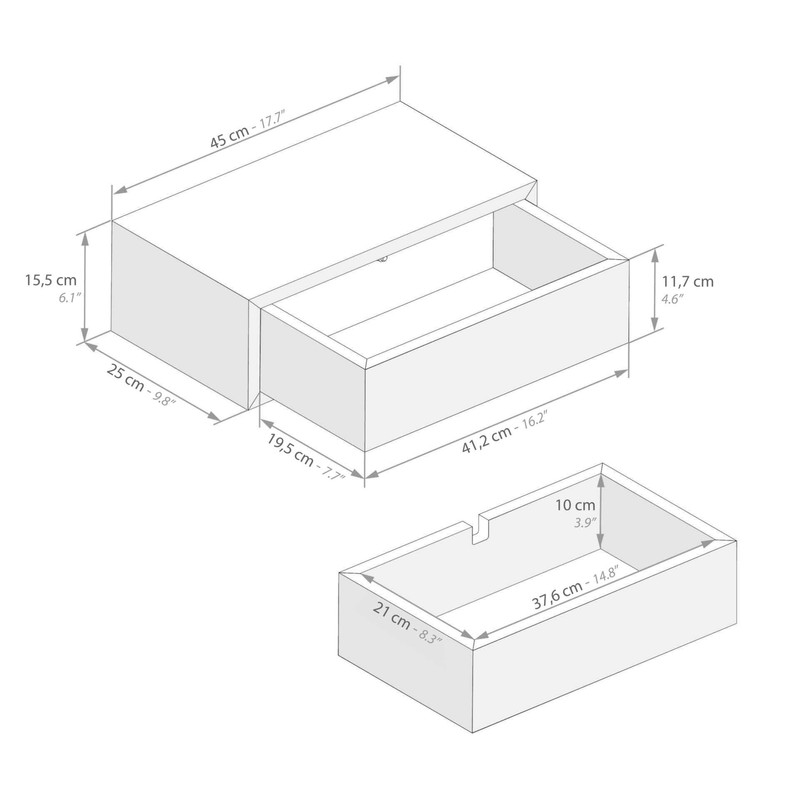 - OPTIMISE SPACES: Take advantage of wall space! The minimalist style of the Riccardo wall-hung bedside table and the possibility of fixing it to the wall allow you to better organise confined spaces, keeping them tidy and mess-free.