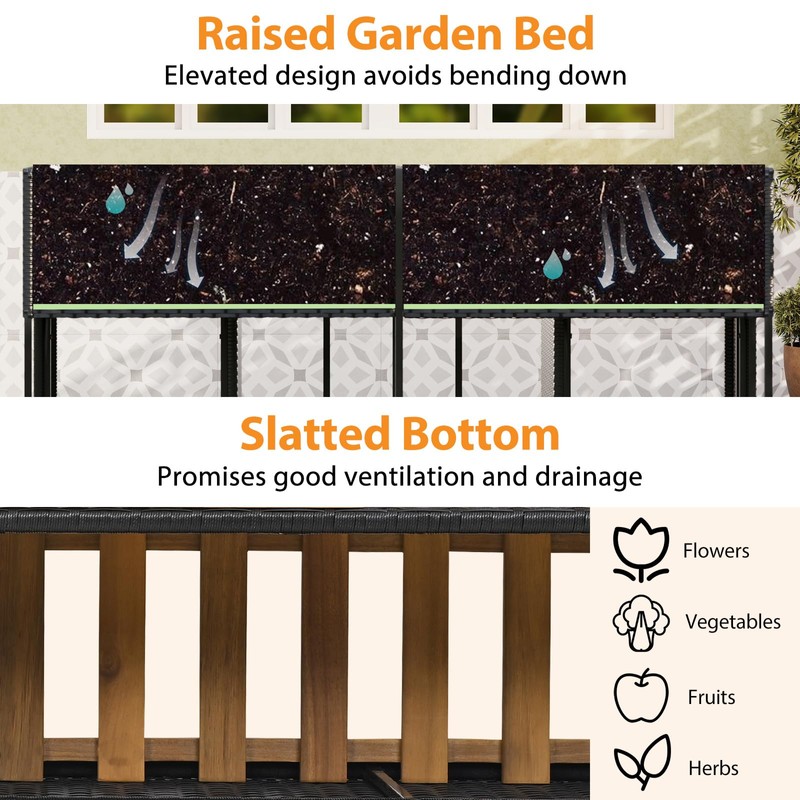 - [Optimal Growing Conditions] The spacious 57.5"L x 8"W x 10"H raised garden bed provides deep, healthy root growth. The slatted base ensures superior drainage and soil aeration for thriving plants.
