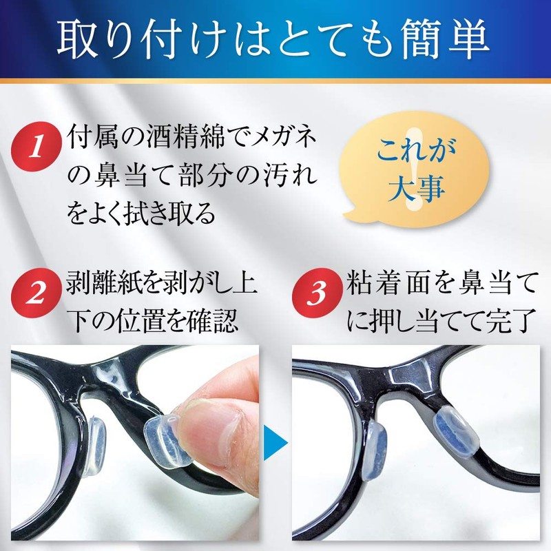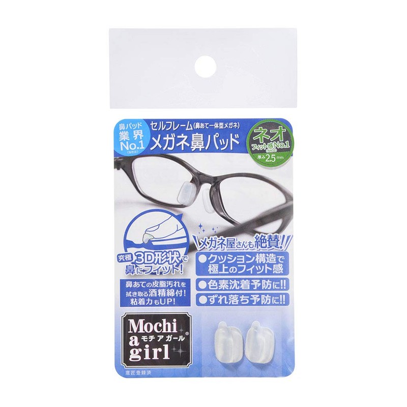 Details can be found on the official Mosquia Girl website. Simply stick it to the nose pads of your glasses to reduce pain and prevent slippage, and prevent marks from sticking to the nose pads. The fit of the glasses can also be reduced to the weight feeling of the weight. The soft silicone material is gentle on the skin and the special 3D shape gives you the perfect fit to your nose. Recommended for those with long eyelashes or those with low noses and are about a medium thickness between the natural type (1.5 mm) and the basic type (3.5 mm). The transparent silicone makes it difficult to stand out and comes with degreased cotton to adhere strongly to your glasses. 1. A registered trademark and design. 2. This product may not be suitable for those with silicone or nose pads that are spherical, or for materials that are difficult to adhesive. 3. Clean the sebum dirt from the nose pad thoroughly with the included degreasing cotton and dry before sticking. (If the frame and nose pads are made of acrylic resin, please do not use the included degreaser cotton to prevent cloudiness, so please degrease the material in a suitable manner. How to use: First stick to glasses is a thin part of the wall and there is no adhesive on the thick part. The thick one is the image of a thin part of the nose. The thick parts that pop out from the nose pads are cushioned to fit your nose. 1. First, wipe off the sebum of the nose pad with degreased cotton and let it dry. (*If the frame and nose pads are made of acrylic resin, please do not use the included degreasing cotton to prevent clurving, and degreasing the material in a manner. 2) While holding a thick neo-type part, pinch the ear of the release paper and peel it off. 3. Paste the thin part lightly to the nose pad of your glasses, and position both of them Please note that if you reposition it over and over again, it will become difficult to stick! 4. Once the position is determined, press and stick it firmly. 5. The adhesive strength will increase after a day.
