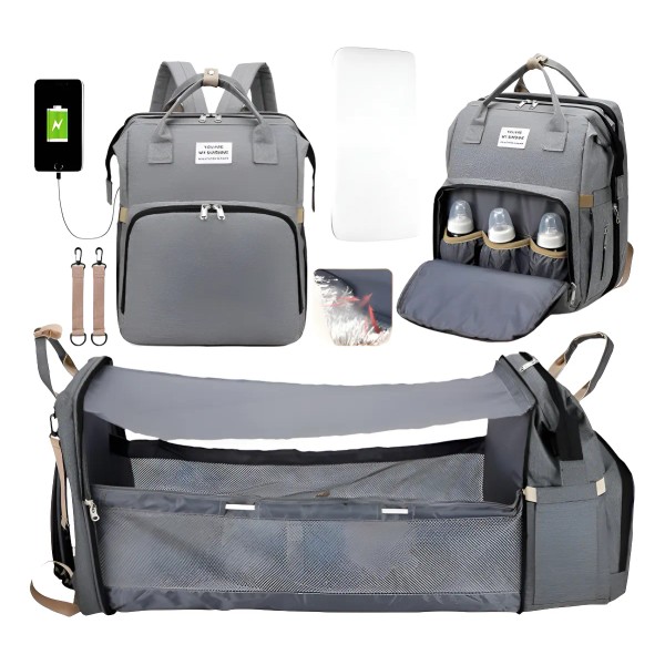 Mochila Pañalera Bebé Multifuncional Impermeable Usb Gris Nube