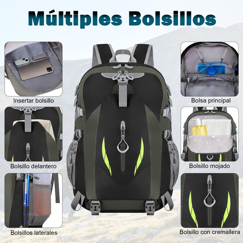 - Esta mochila de senderismo está diseñada con características profesionales de montañismo y es completamente funcional. Las correas de compresión y las hebillas de cordón elástico aseguran los bastones de trekking. Hay un cinturón tejido con hebilla en la parte inferior para guardar almohadillas a prueba de humedad. El compartimento principal incluye dos ganchos para una bolsa de agua y un orificio para tubería de agua en el costado. Además, hay un silbato de supervivencia en la correa del pecho