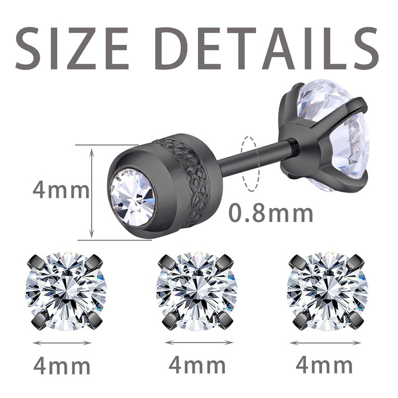 - Earrings size: zirconia stud earrings diameter 3/4/5 mm, zirconia stud bar thickness 0.8 mm (20G), flat back earplugs diameter 4 mm. Earring sizes are suitable for all men and women. Simple and stylish earrings are suitable for wearing alone, stacking, or with other earrings.