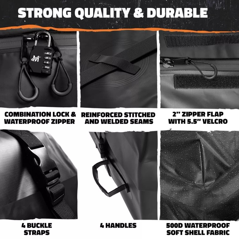 - 100% waterproof cargo bag protects your belongings with 25 cu ft. of dry storage space.
