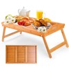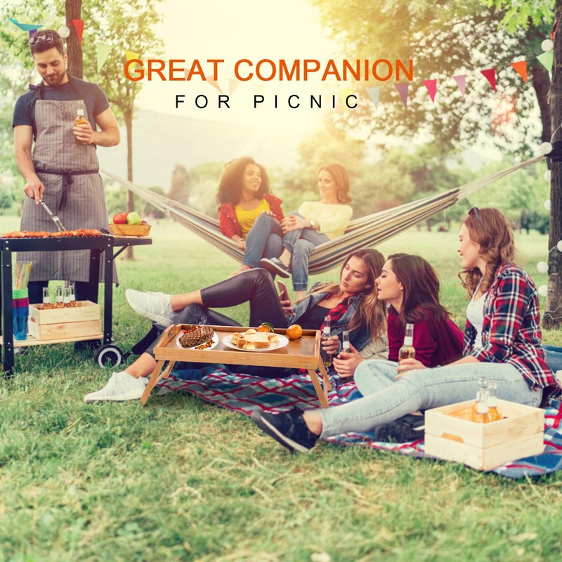 - 【Natural Bamboo Material & Prevent leakage】Foldable legs and two hollowed out handles for easy carrying. Surrounding tray lips prevent items from falling over. No need to worry any liquid will spill out of food tray to get your clothes or sheet dirty
