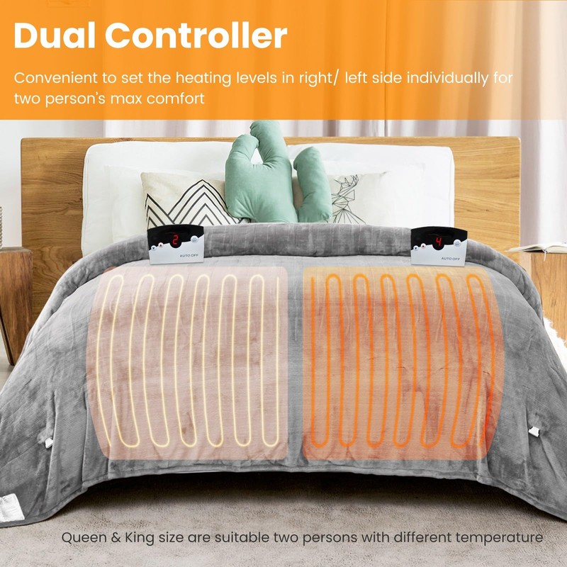 - Dual Controllers & Long Cable: Comes with dual controller with 6.2ft power cable and 12.8ft controller cable, long enough to connect to outlets, accompany you with fighting those cold winter nights. Two controllers allow you to adjust the right and left heating areas individually at random. Simply press the ON/OFF button then press the temperature adjustment buttons to select 10 heating levels as needed
