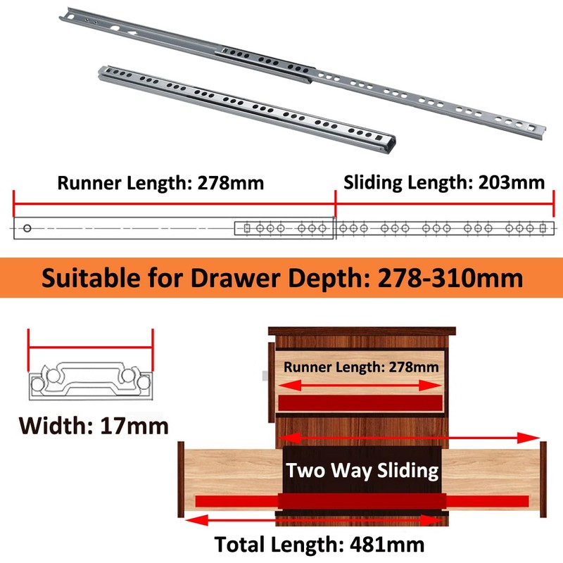 • 【 Widely Application 】 Runner Length: 278mm, Sliding Length: 203mm, Total Length: 481mm. Thickness 10mm, Side mounting and 17mm groove mounting. Ideal for filing cabinets, desk pedestals, Locker, wooden/steel drawers and general storage drawers usage.