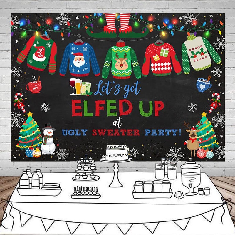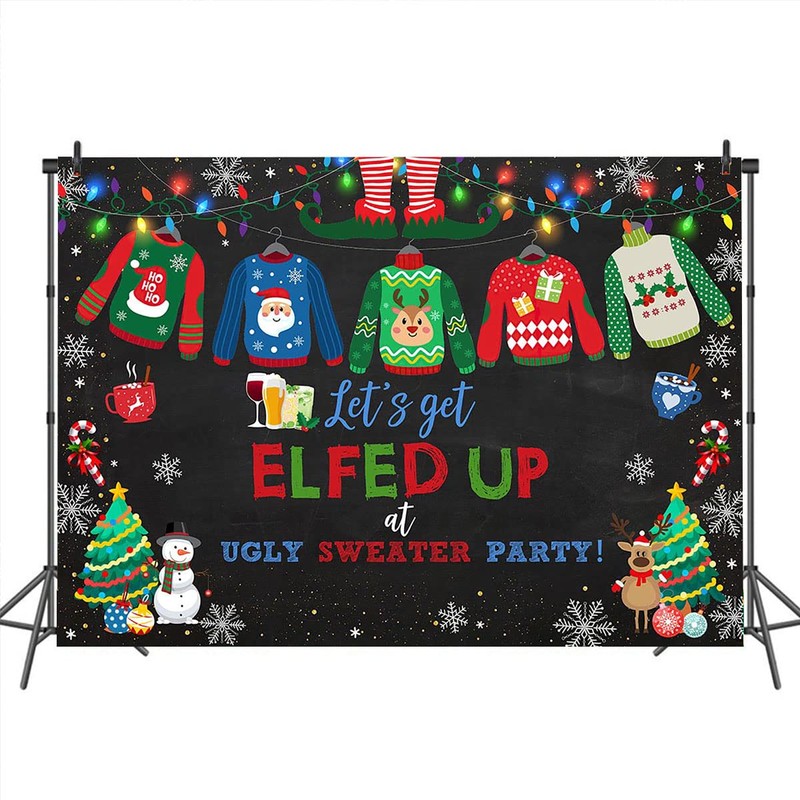 Mocsicka Let's Get Elfed Up Backdrop Christmas Ugly Sweater Party Decorations Happy New Year Eve Family Elfed Party Photo Props (7x5ft)