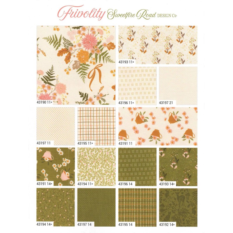 Each set includes forty-two 5x5 inch fabric squares from the Frivolity collection by Sweetfire Road (42 squares in the Charm Pack). Professionally cut and packaged by Moda United Notions. Moda Charm Packs are convenient precut assortments of color-coordinated 5-inch (12.7cm) fabric squares. The squares are professionally cut using Moda's unique micropinking technology that reduces edge fraying to allow easier piecing and smaller seam allowances. Perfect for any patchwork project including quilt tops, fashion apparel, home decor and scrapbooking.
