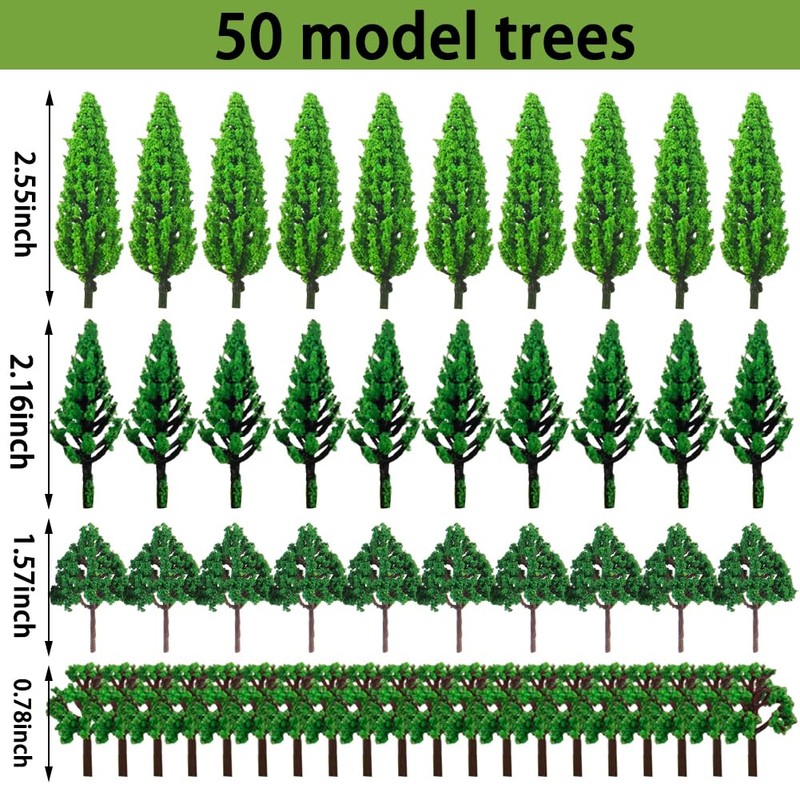 - *50pcs in Pack: This product has a pack of 50pcs pvc tree model in it, a cheaper choice for getting enough miniature trees you need;