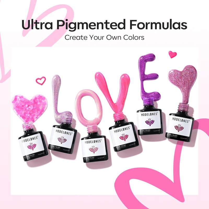 • Pink Heart Collection: 6 Pcs Pink Gel Polish (0.24 fl.oz each) + 1 Wooden Pen for positioning heart-shaped glitter, perfect for creating beautiful glitter nail art designs. With a custom love-shaped flash, it's an ideal gift for her. *Note: For best results, apply thin layers and finish with several coats of top coat until the surface is smooth