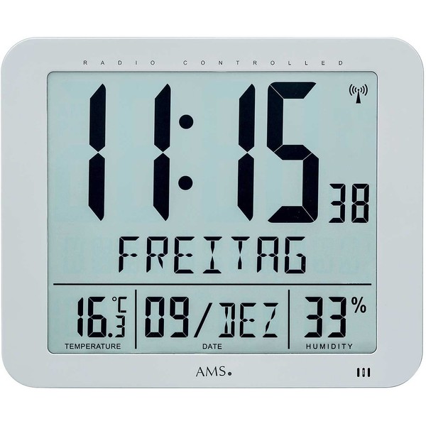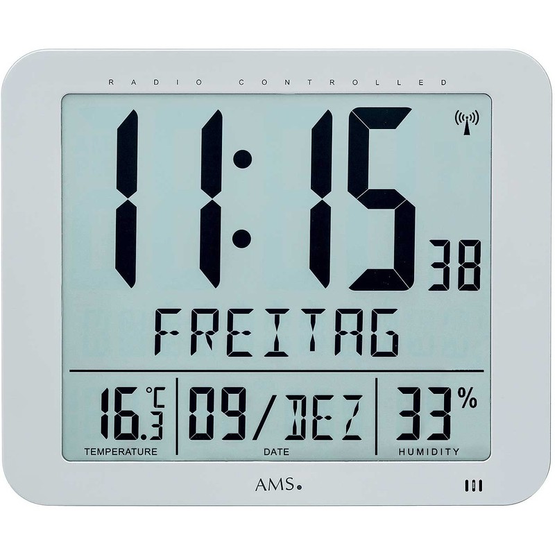 - Dimensions: 21 cm x 25 cm x 3 cm (H x W x D). Battery: 4 x LR6 alkaline (not included). Functions: hour, minute, second, date, day of the week, temperature, humidity. Casing: silver plastic housing. Weight: