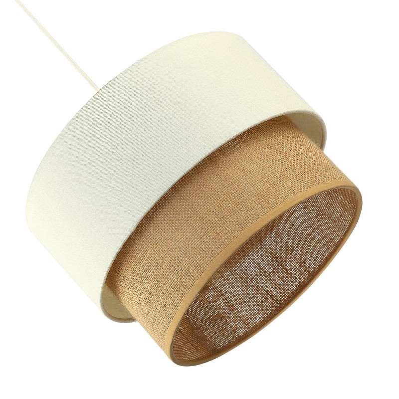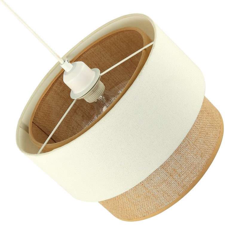 - Features cream linen fabric drum upper shade and natural brown rattan lower shade.