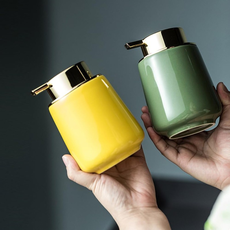 - Yellow Soap Dispenser: This decorative soap dispenser designed with classic shape and golden pump head will become a practical and charming decoration in your home.