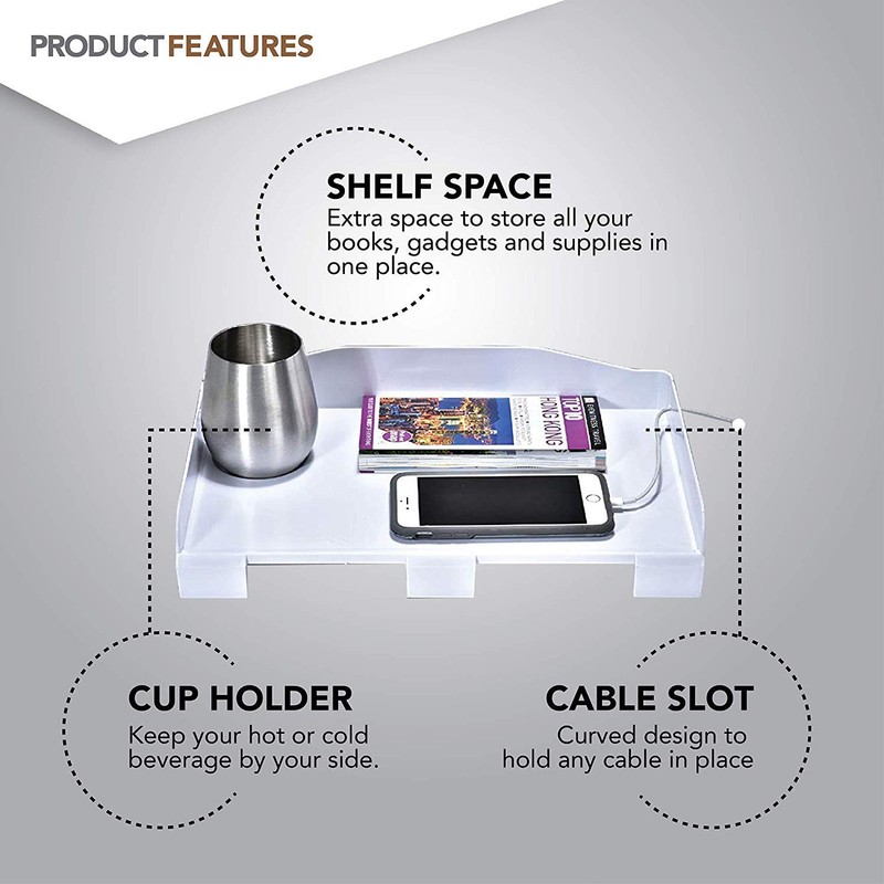 Modern Innovations Bedside Shelf for Bed, College Dorm Room, Bunk Bed Shelf/Caddy for Top Bunk, Clip On Nightstand Tray with Cord and Cup Holder for Table Storage (White)