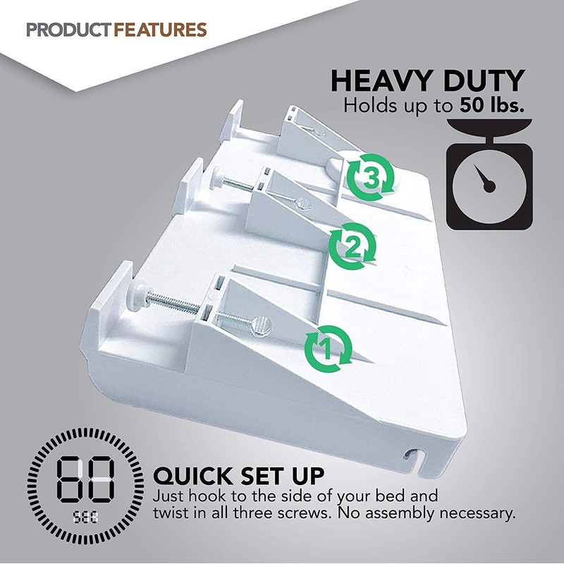- Bed Side Shelf: Made of premium plastic, our nightstand provides instant bedside storage for your stuff. Our tray attaches to your bed frame with no tools required! For 1.5 inches (4cm) thick bedposts or less. Dimensions: 9" L x 14.75" W x 2.5" H.