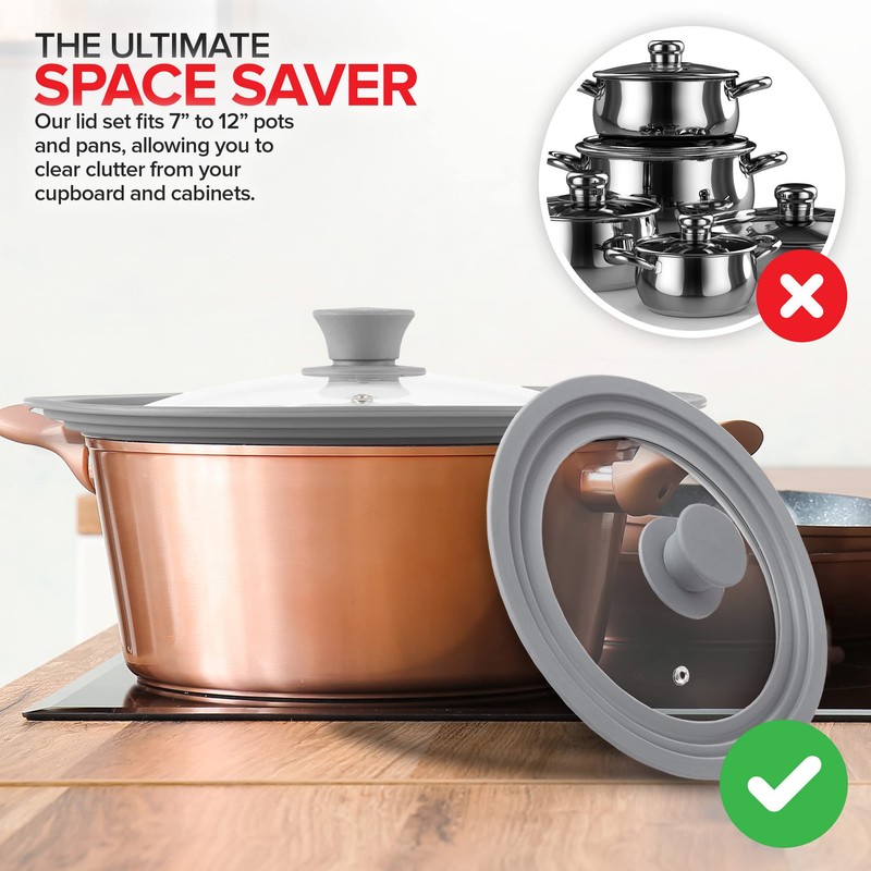 - The Ultimate Space Saver: Goodbye multiple pot and pan covers - our lid set is the only one you'll need! Our small fits 7", 8", and 9"cookware, and our large fits 10", 11", and 12". *Not suitable for pots & pans with tall handles.